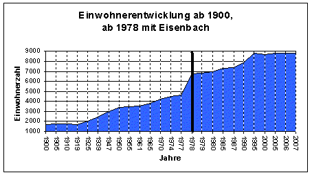 Die Eingemeindung Eisenbachs brachte neuen Zuwachs Nach der bayerischen Gebietsreform im Jahre 1978 stieg die Einwohnerzahl der Stadt Obernburg kräftig um die Eisenbacher Bevölkerung auf 6730 an. Seither lassen sich die Einwohnerzahlen der beiden Stadtteile statistisch nicht mehr trennen. In den Folgejahren wuchs die Bevölkerung infolge einer regen Bautätigkeit in den neu erschlossenen Neubaugebieten in der Rüdhöhle, am Mömlingtalring und in Obernburg-Nord stetig an und erreichte im Jahre 1990 mit 7900 Menschen einen neuen Höchststand.