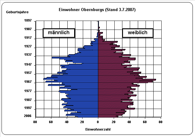 Zuzug von Auswärtigen in den Wirtschaftswunderjahren In dieser Zeit beschäftigte das Glanzstoffwerk etwa 6000 Menschen. Viele davon ließen sich in Obernburg nieder. Die Kleiderindustrie bot Arbeitsplätze, neue Schulen mit zahlreichen Lehrerstellen wurden neu eingerichtet und Betriebe mit vielen Beschäftigten florierten. Neue Gewerbegebiete im Weidig schufen die Gelegenheit zur Schaffung von vielfältigen Arbeitsplätzen in Industrie und Handel. Die ersten Gastarbeiter fanden Aufnahme in der Kreisstadt. Außerdem sorgte die Nähe zum Wirtschaftsraum Rhein-Main dafür, dass Menschen Obernburg als ihre Wohnstadt erwählten und von hier aus pendelten. So kletterte Obernburgs Einwohnerzahl bis ins Jahr 1977 auf 4605 Personen. Der Bedeutungsverlust der Kreisstadt Obernburg durch die Verlegung des Landratsamtes nach Miltenberg schlug sich bei der Entwicklung der Einwohnerzahlen nicht nieder, denn Obernburg lag günstig im Zuzugsgebiet das Ballungsraumes Rhein-Main.