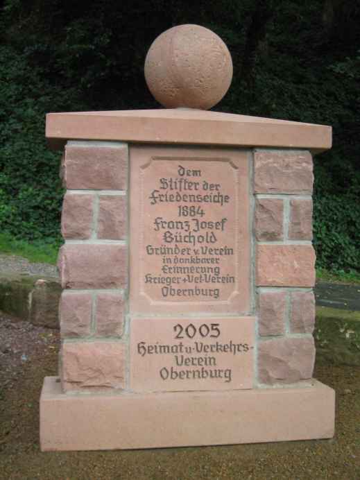 „Dem Stifter der Friedenseiche 1884 Franz Josef Büchold, Gründer des Vereins, in dankbarer Erinnerung Krieger- und Veteranenverein Obernburg, 19. Juni 1918“