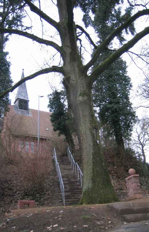 Der Gedächtnisstein unmittelbar am Eingang unter der 50jährigen Eiche, die 1884 von dem um Obernburg verdienten Stadtmagistrat Franz Josef Büchold gestiftet wurde – die Eiche (und die flankierenden anderen Bäume, vor allem Fichten) haben in dem halben Jahrhundert eine vorzügliche Entwicklung durchgemacht – trägt folgende Inschrift: