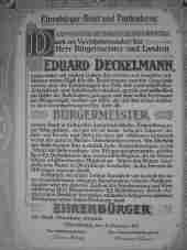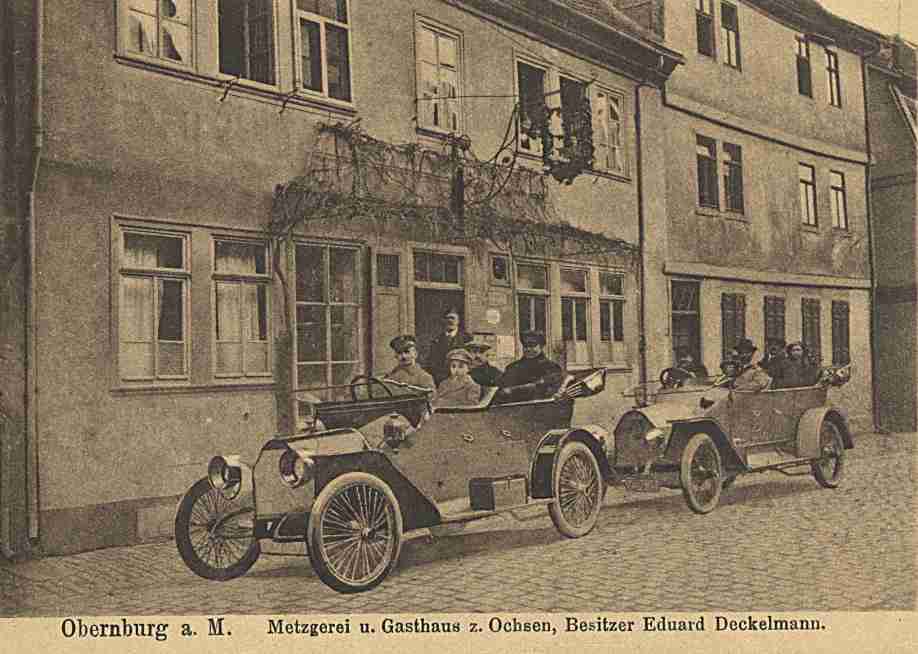 Aus dem Obernburger Boten "Gestern verstarb Altbürgermeister Eduard Deckelmann. Mit ihm ist ein Mann dahin gegangen, dem viel Freud und Leid im Leben beschieden war. Freud in den ersten Jahren seines häuslichen und gemeindlichen Wirkens und in seinen letzten Lebensjahren im Kreise einer lieben Familie. Aber auch ein reiches Maß von Leid, indem er seine erste Gemahlin mit sämtlichen Kindern aus dieser Ehe frühzeitig ins Grab sinken sah. Das hiesige Gasthaus "Zum Ochsen" war in jungen Jahren sein Arbeitsfeld. Den "Ochsen", in dem schon König Ludwig I., von Aschaffenburg kommend, einkehrte, brachte Deckelmann auf eine beachtenswerte Höhe. Seine Metzgerei und Wirtschaft boten nur Gutes und er selbst war das Muster eines Geschäftsmannes. Begabt mit einem herzlichen Humor und mit einer kräftigen Stimme war er lange Jahre Vorstand des hießigen Männergesangvereins, der auch im "Ochsen" sein Probelokal hatte. Wer zählt die schönen Stunden, welche die Sänger hier verlebten. Frühzeitig, schon unter Bürgermeister Kreß, griff er ins gemeindliche Leben und Wirken ein. Im Gemeindekollegium wirkte er ebenso vielseitig und glücklich wie später als Bürgermeister. Mainbrücke, Wasserleitung, neue Knabenschule, Kanalisation usw. hat er im Verein mit der Stadtvertretung energisch gefördert. Als langjähriger Landrat (Anmerkung: heute Kreisrat) vertrat er gewissenhaft die Interessen des Bezirkes. Der Verlebte wird in der Geschichte Obernburgs und des Bezirkes immer einen ehrenvollen Platz einnehmen."