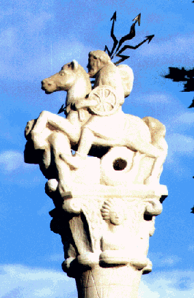 Die Krönung der Jupitergigantensäule ist die Reitergruppe. Bei den meisten Darstellungen reitet Jupiter über den am Boden kauemden Giganten. Die Bewohner der römischen Provinzen kannten den aus der griechischen Mythologie stammenden Kampf der olympischen Götter gegen die Giganten, der mit Hilfe des Hercules gewonnen wurde. Jupiter wird hier mit dem Blitzbündel als oberster Himmelsgott der Römer dargestellt. Das hier wie auf vielen Säulen abgebildete keltische Rad symbolisiert ihn gleichzeitig als Taranis, den Licht- und Himmelsgott der Kelten, wobei es im Gegensatz zu den römischen Götterdarstellungen bei den Kelten allerdings keinerlei Namensnennungen für die Götter gibt. Jupiter reitet mit seinem Pferd über einen Giganten, der den Gott in den Fuß beißt.