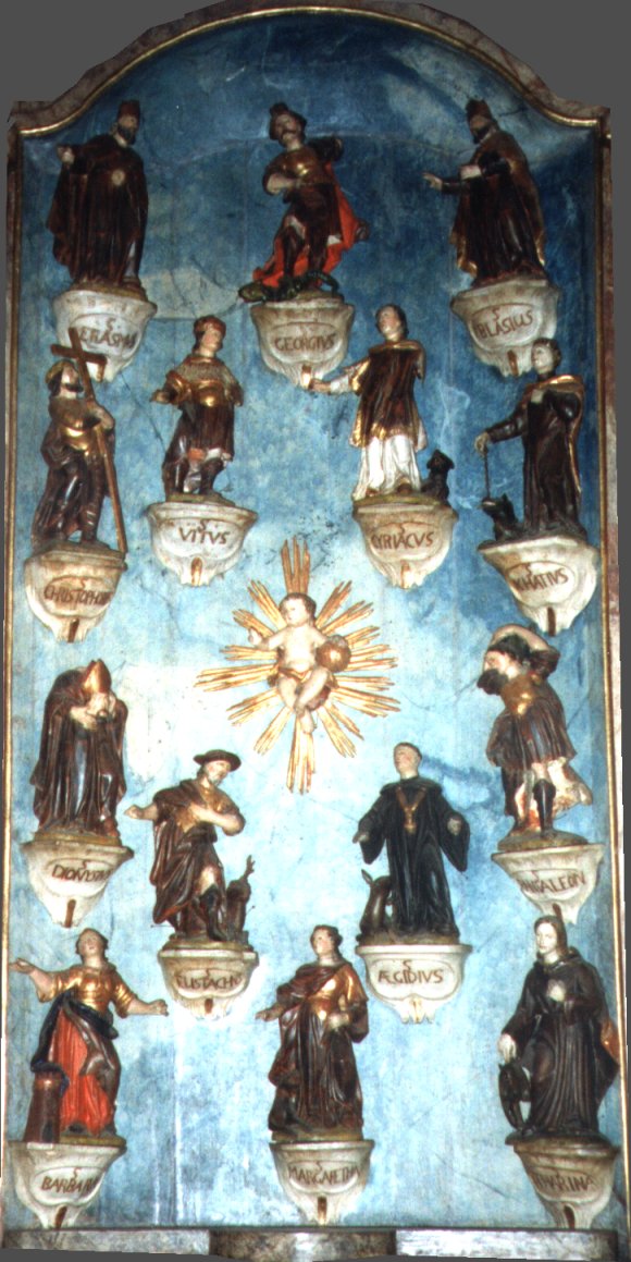 Drei Altäre, alle gegen Ende des 18. Jh. in der Obernburger Sankt-Anna-Kapelle errichtet, gehörten 200 Jahre lang zur Innenausstattung der Kapelle. In den letzten Jahrzehnten hat man davon zwei barocke Altaraufbauten entfernt, ließ erfreulicherweise aber den Altar der 14 Nothelfer in seiner ursprünglichen Form erhalten. (Vielleicht hat einer der 14 Heiligen rechtzeitig ein Veto gegen den Abbruch eingelegt). Der Altar zeigt in der Mitte Christus um den die 14 Nothelfer gruppiert sind, als Sinnbild für die “Vermittlerrolle” der Nothelfer zwischen den Gläubigen und Christus. Als 1991 die Figürchen am 14-Nothelfer-Altar der Sankt-Anna-Kapelle von den zwei Restauratorinnen Christel Matthis aus Erfurt und Christiane Thiel aus Potsdam gründlich von Ruß und Schmutz gereinigt und ausgebessert wurden, übernahm auch der Heimat- und Verkehrsverein die “Patenschaft” für eine der Figuren. Die Figuren sollten wieder in den Urzustand versetzt werden, was sich zum Teil sehr schwierig gestaltete, da an manchen Figuren im Laufe der Zeit “Schönheitsreparaturen” vorgenommen worden waren. Der Körper der Figuren besteht aus Holz, auf das eine Grundierung aus Kreide und Leimwasser aufgetragen wurde. Erst danach wurde mit Farbe gearbeitet. Der Altar stammt von dem Schreiner Armbruster aus Großostheim, die Figürchen wurden geschnitzt von Peter Vambach aus Erlenbach bei Marktheidenfeld.