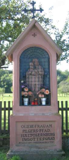 Unser erster Rundgang beginnt beim Bildstock am Pilgerspfad neben dem Obernburger Wasserhaus und führt uns bis zum Waldhaus und wieder zurück. Über diesen Bildstock schreibt der verstorbene Rektor Josef Michelbach: "Das Bildhäuschen an der Flurabteilung Pilgerspfad hält als stummer Mahner letzte Wacht an einem Weg den vor einigen hundert Jahren fromme Wallfahrer von der Donau an den Main zum Rhein gegen Aachen pilgerten". Und weiter: "Einst führte hier vom Main abzweigend ein Pilgerweg über Mainz nach Aachen..... Nicht bloß aus Deutschland kamen sie hergewallt, sondern auch aus Böhmen und Ungarn."
