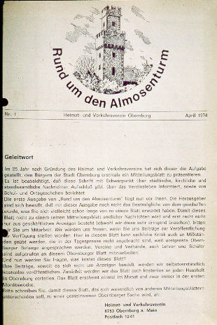 Eine über mehrere Jahre nach der Methode “trau mich nicht” vor uns hergeschobene Absicht wurde zum 1. April 1974 endlich umgesetzt. Mit der Herausgabe des Obernburger Mitteilungsblattes “Rund um den Almosenturm” ging für viele ein lang gehegter Wunsch in Erfüllung. Nicht nur die Bevölkerung, auch der Bürgermeister, die Stadtverwaltung und der größte Teil des Stadtrates begrüßten die Herausgabe durch den HVV. Nur zwei oder drei Stadträte konnten und wollten den Herausgeber nicht akzeptieren. Seit 1987 ist die Stadt selbst nun Herausgeber vom “Almosenturm”.