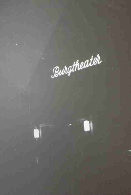 Die Sondstootrebbe, schee gemauert, Die Bilderkäste on de Wenn, De große Boom devor. De Mormorbode vor de Kasse, Die Kasse rechds, die Drobbsjen links, Dezwische neie Filmplakade Von Filmschen, die scho uff oon warde, Oh, hett mer doch defier scho Karde! Unn donn es Allerheilischste, de grouße Kinosaal, Mit Losche, Sperrsitz unn Parkett, Rasiersitz, kloer, die worn fer uns, Des longt sou, allemol. Die Wenn, all iwwersponnt Mit roudem Kunststofflädder, Roud eleschont aa de long Vorhong, Joo, des wor scho e gudi Stuwwe, Wou’s doch bei jedem Wedder Schee wor.