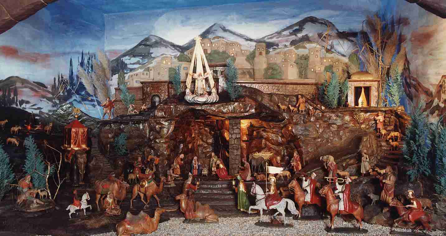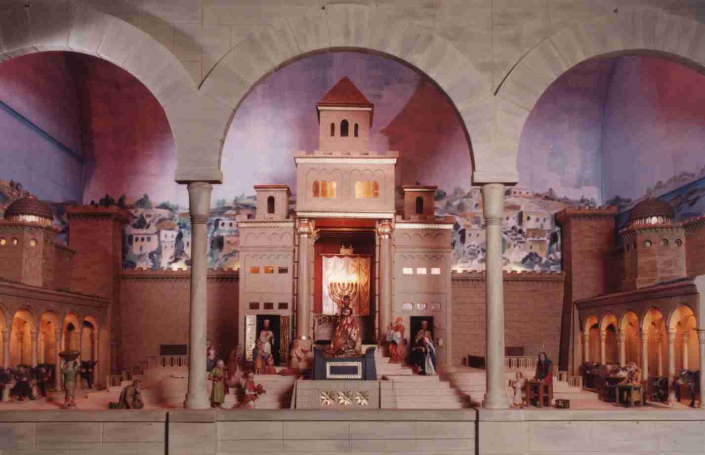 Anfang 1950 wurde ein eigener Krippenraum an die Kirche angebaut und beim Neubau der Kirche verlegte man die Krippe in einen Nebenraum der Unterkirche. Leider wurde dann die Tempelanlage nicht mehr aufgebaut und die Einzelteile lagerten jahrelang in Scheunen und in der Abstellkammer neben dem Krippenraum. Seit 1985 ist die Tempelanlage als Dauerausstellung neben der Krippe in der Unterkirche wieder zu sehen. Vorausgegangen war eine gründliche Renovierung und Restaurierung der gesamten Anlage durch unsere Stammtischrunde. Probleme bereitete insbesondere der schlechte Zustand des Tempels und ein starker Holzwurmbefall der gesamten Anlage. Durch eine Spezialfirma wurde der gesamte Krippenraum mehrere Stunden mit Heißluft behandelt bis auch im Innern der Holzteile eine Temperatur von 60 – 70 Grad erreicht wurde. Um einen Neubefall zu vermeiden, wurde die Rückseite der Konstruktion mit einer Borsalzlösung eingesprüht und die Anlage mit Glasscheiben eingehaust. Ohne diese gründlichen und aufwändigen Maßnahmen wäre ein weiterer Verfall des gesamten Kunstwerkes nicht zu verhindern gewesen.